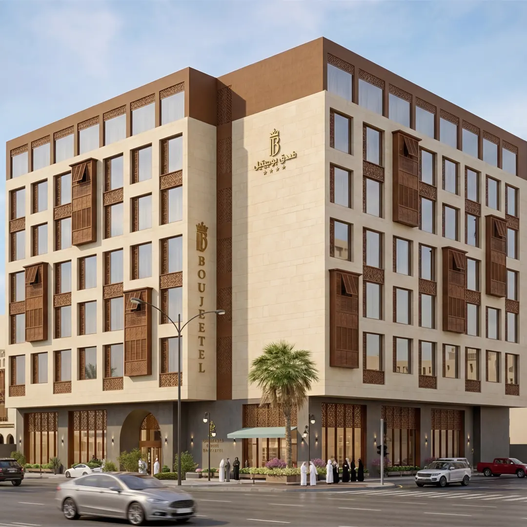 Hexa Line Projects is responsible for the full design and construction supervision of the Boujitel Hotel, a 4-star hospitality establishment in Madinah, for Bouji Hospitality Services Company. The project is currently at its final design stage, with design documentation being finalized for construction commencement. The hotel is intended to serve the significant pilgrim and visitor population that Madinah attracts throughout the year.